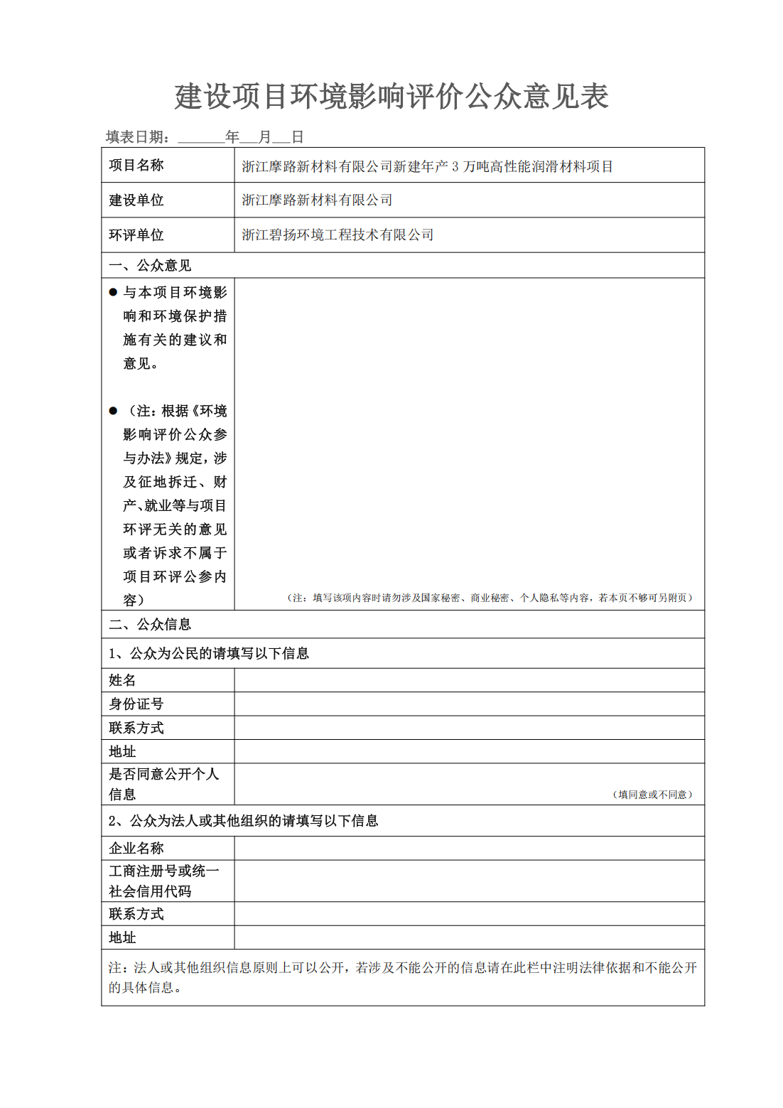 Public Opinion Survey Form for Environmental Impact Assessment of MOLU's 30,000-ton High-performance Lubricant Material Project